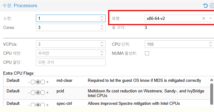 기본으로 설정되는 CPU 타입(kvm64 등)은 오래된 서버와의 호환성을 위해 이 요구사항을 충족하지 못했죠. image