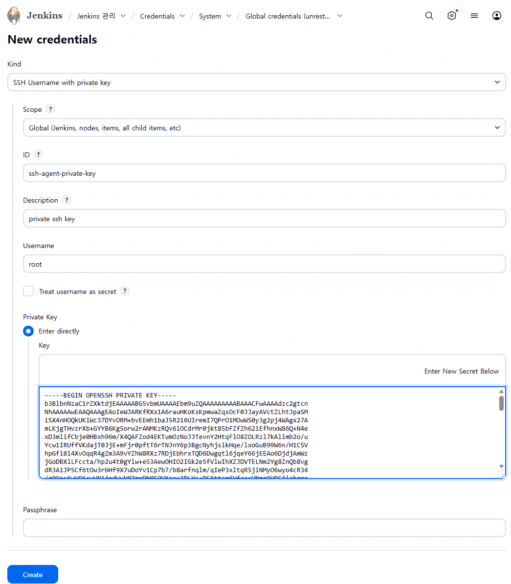 원격 서버측에서 생성된 Private key 정보를 Jenkins SSH 인증 정보에 등록해줄겁니다.