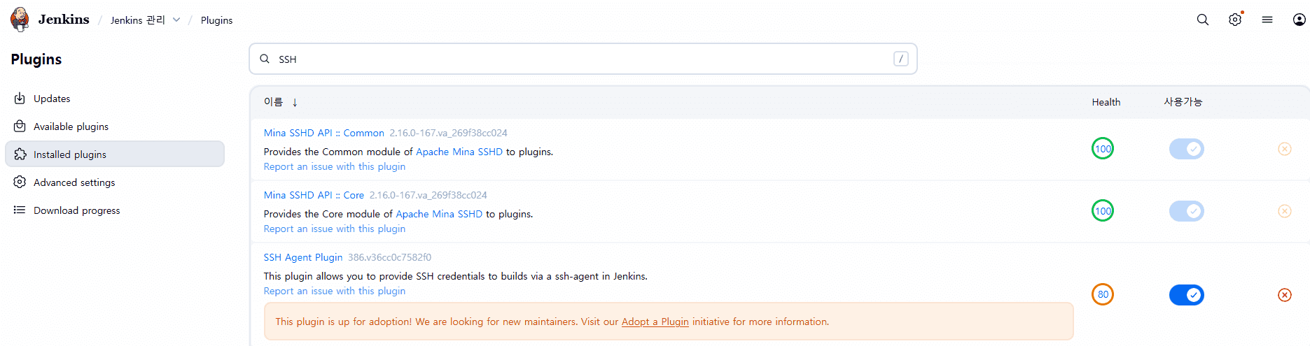 왼쪽 메뉴의 Available plugins에서 SSH Agent를 검색하여 인스톨 버튼으로 설치가 가능합니다.